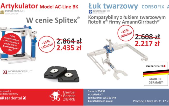 Do końca kwietnia przedłużamy promocję na cały asortyment sklepu z produktami niemieckiej firmy Malzer Dental: artykulatory, łuki twarzowe, wsporniki widelca pinarki, sanie transferowe, stoliki transferowe, masy, piny, płytki, formy do [...]